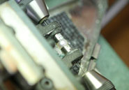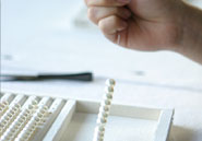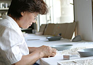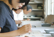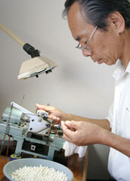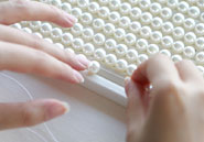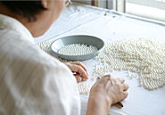 連組みによって振り分けられた真珠を糸でつなぎ合わせる作業です。通常は連組みとセットで行われ、手を動かす以外でも常に品質管理のための注意力が必要とされます。