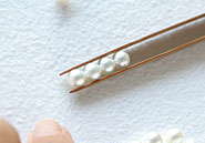 素材の輝きと透明感をよりハッキリさせるために、真珠の染み抜きをし、更なる選別を行います。