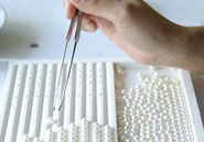連ネックレス用の真珠は、キズ、凹凸の具合、大きさや色などによって、繋げた際に違和感のないように振り分けられるのですが、これも長年の経験と審美眼が必要とされる作業となってきます。